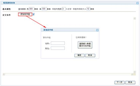 点击【新增资源】按钮,选择“自定义报表”区域的【通用查询】图标,点击【下一步】,进入“配置通用查询”界面。